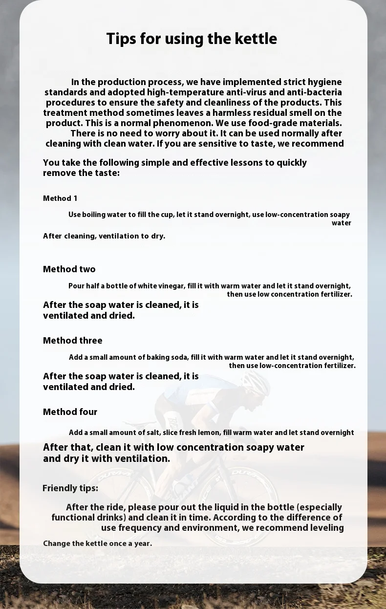 After cycling, please pour out any liquid (especially energy drinks) in the bottle promptly and clean it immediately. Depending on usage frequency and environmental conditions, we recommend replacing the water bottle once a year on average.